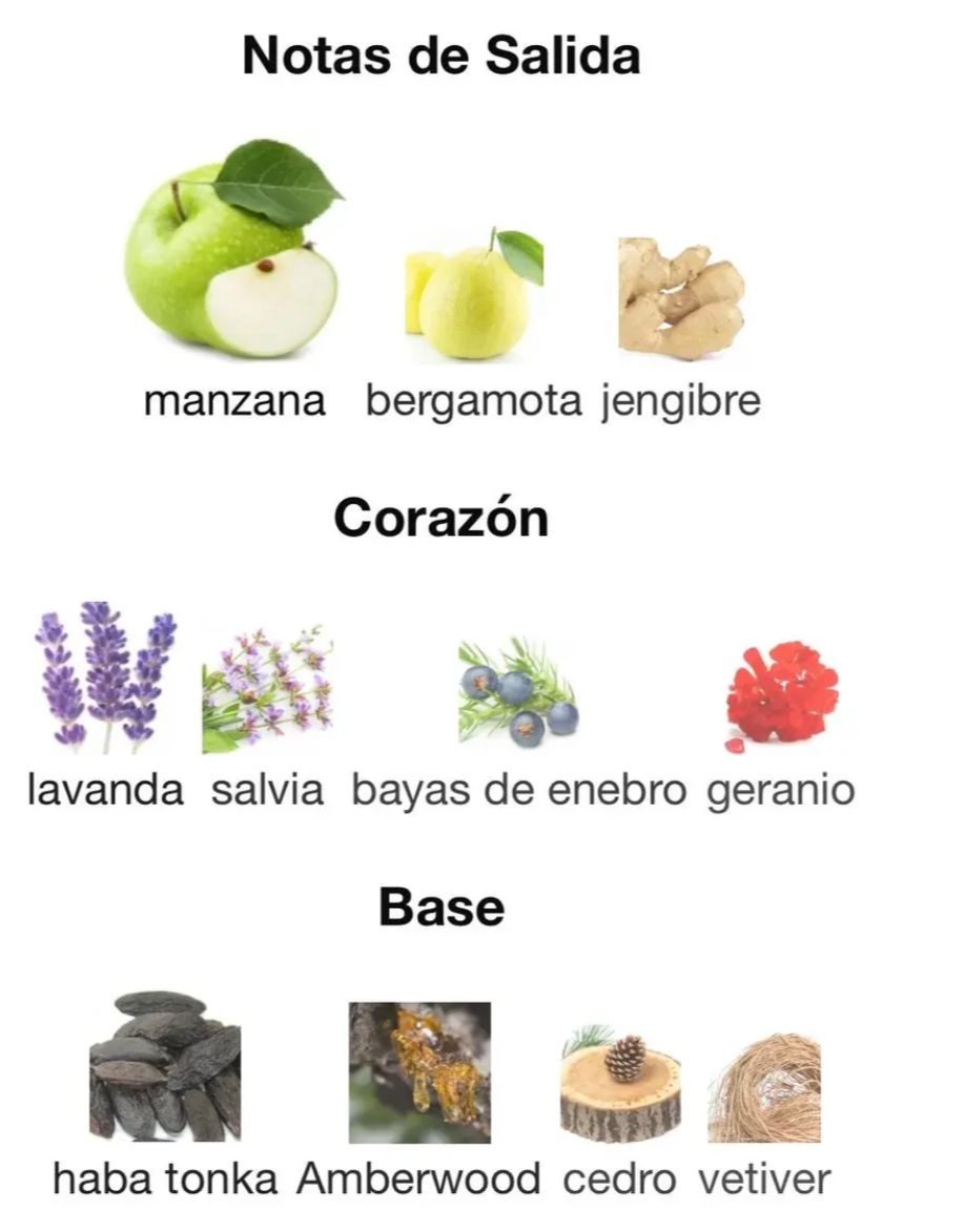 Las notas de cabeza exudan una fusión fresca y especiada de bergamota, jengibre fuerte y manzana dulce, armonizadas aún más con notas de corazón suaves de lavanda y bayas de enebro.