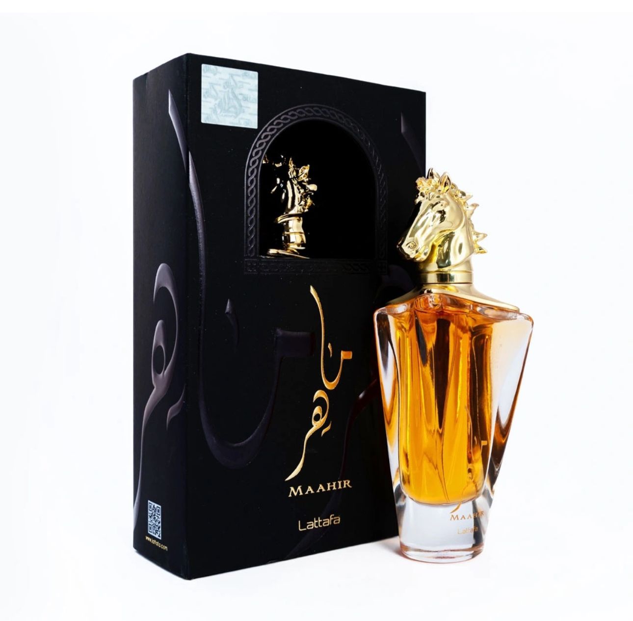 Maahir de Lattafa Perfumes es una fragancia de la familia olfativa Ámbar Floral para Hombres y Mujeres. Maahir se lanzó en 2020. Las Notas de Salida son bayas rojas, durazno (melocotón) y bergamota; las Notas de Corazón son jazmín, peonía y azucena roja; las Notas de Fondo son sándalo, flor de vainilla y almizcle.